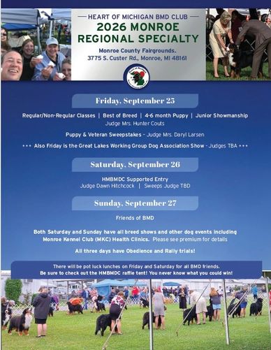 In conjunction with the Monroe Kennel Club Dog Show, each fall the HMBMDC hosts a BMDCA Regional Specialty and holds a Supported Entry. This is located at the Monroe County Fairgrounds, Monroe MI.